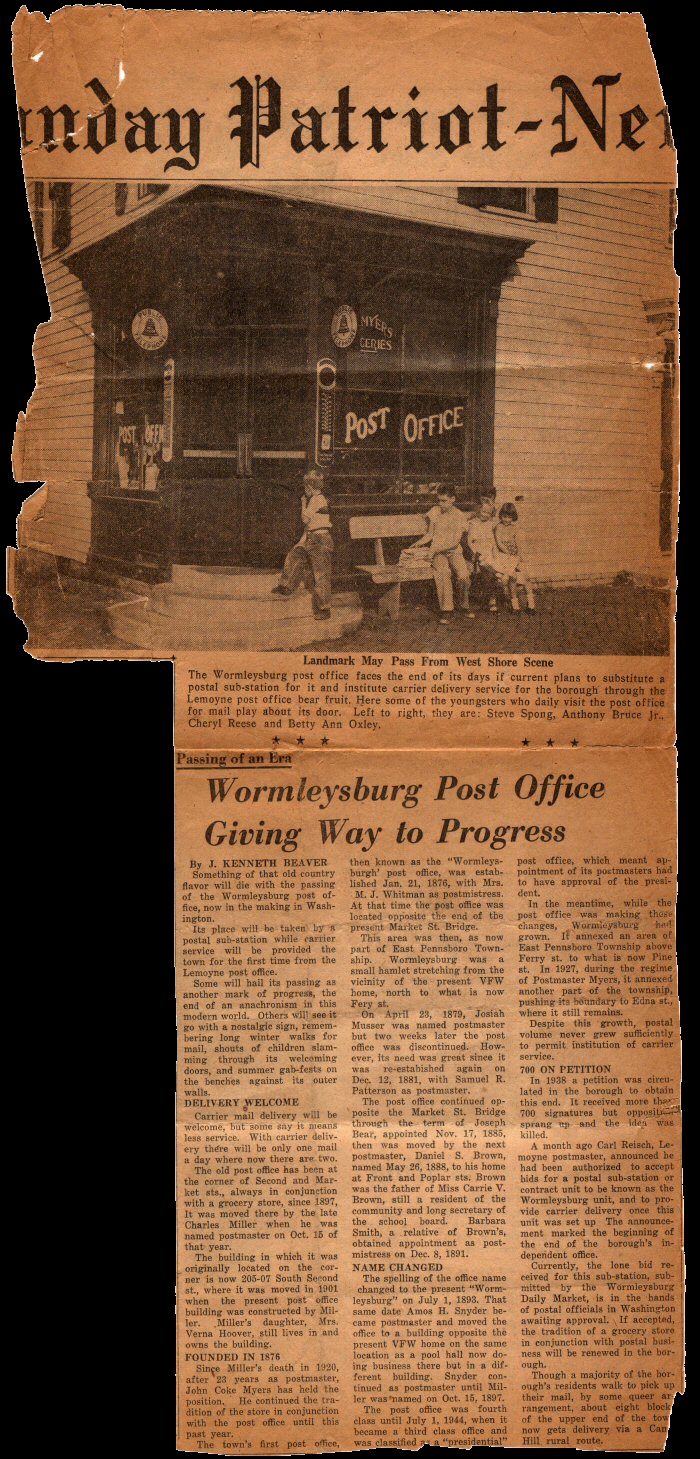 I found this Post Office and Store in Wormleysburg, PA in a newspaper clipping when I was sorting through my father's old papers. I'm estimating the publishing date as the early 1940s.