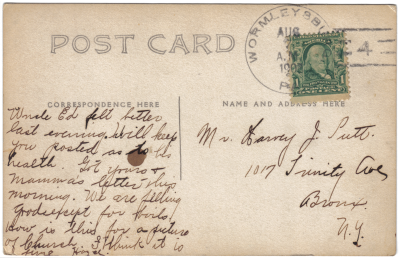 "How do you feel hope you are better you should have been here last night your baker boy was up and skater. let me hear from you. Verna" Addressed to Miss Hazel Putt #1017 Trinity Ave. New York City. N.Y. Postmarked Wormleysburg, PA AUG 14 PM 1908 |