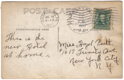 "This is the new hotel at home." Addressed to Miss Hazel Putt #1017 Trinity Ave. New York City. N.Y. Postmarked Wormleysburg, PA JUL 12 P.M. 1907 |